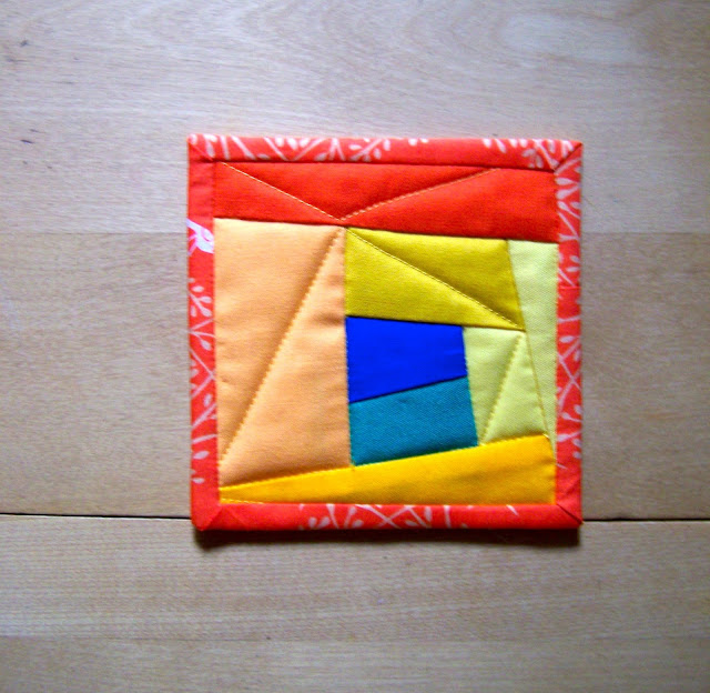 I exchanged mini, minis with Anja of Anja Quilts. Anja used my favourite colour blue to make this for me. Here's the mini mini I made in Anja's favourite colour of Orange. Some of my oranges look a bit yellow in this photo.
