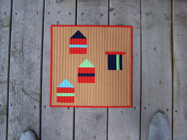 Once I landed on an arrangement I liked I worked out how to link the houses up with the tan background. I opted for straight line quilting and poppy red binding.